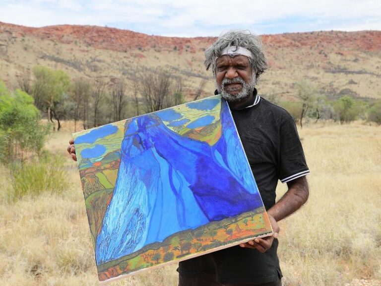 I paint about my Country. Mount Sonder, Glen Helen, Hermannsburg. I paint mountains like Muntunda — that’s not far from Hermannsburg. My mother’s side is Papunya and my father’s side is Hermannsburg. Lots of family. I paint my dreaming’s. Big rock dreaming’s, snake dreaming’s. Come from that way — long way — right up to Alice Springs. Blue Mountain, Mount Sonder, that's my dreaming — big dreaming’s, that's my mother’s side and my grandmothers.”