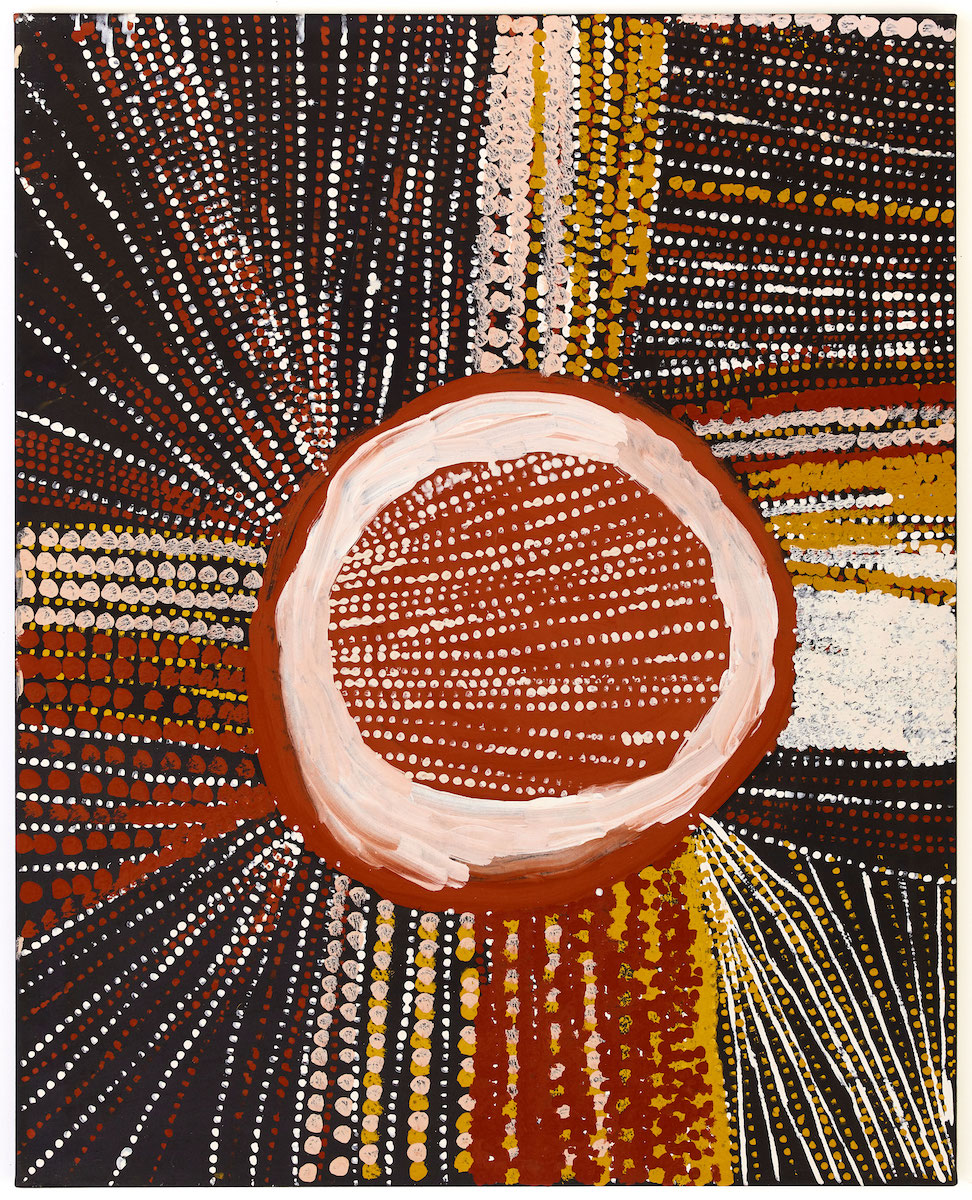 Conrad paints using ochres or earth pigments sourced from around Milikapiti. The overarching themes of his work depict the wet season Pakatiringa (rain) and the Kulama initiation ceremony. This is represented by large concentric circles that refer both to the yams prepared during the ceremony and large rings that appear around the moon in late wet season signifying the beginning of the Kulama season.
