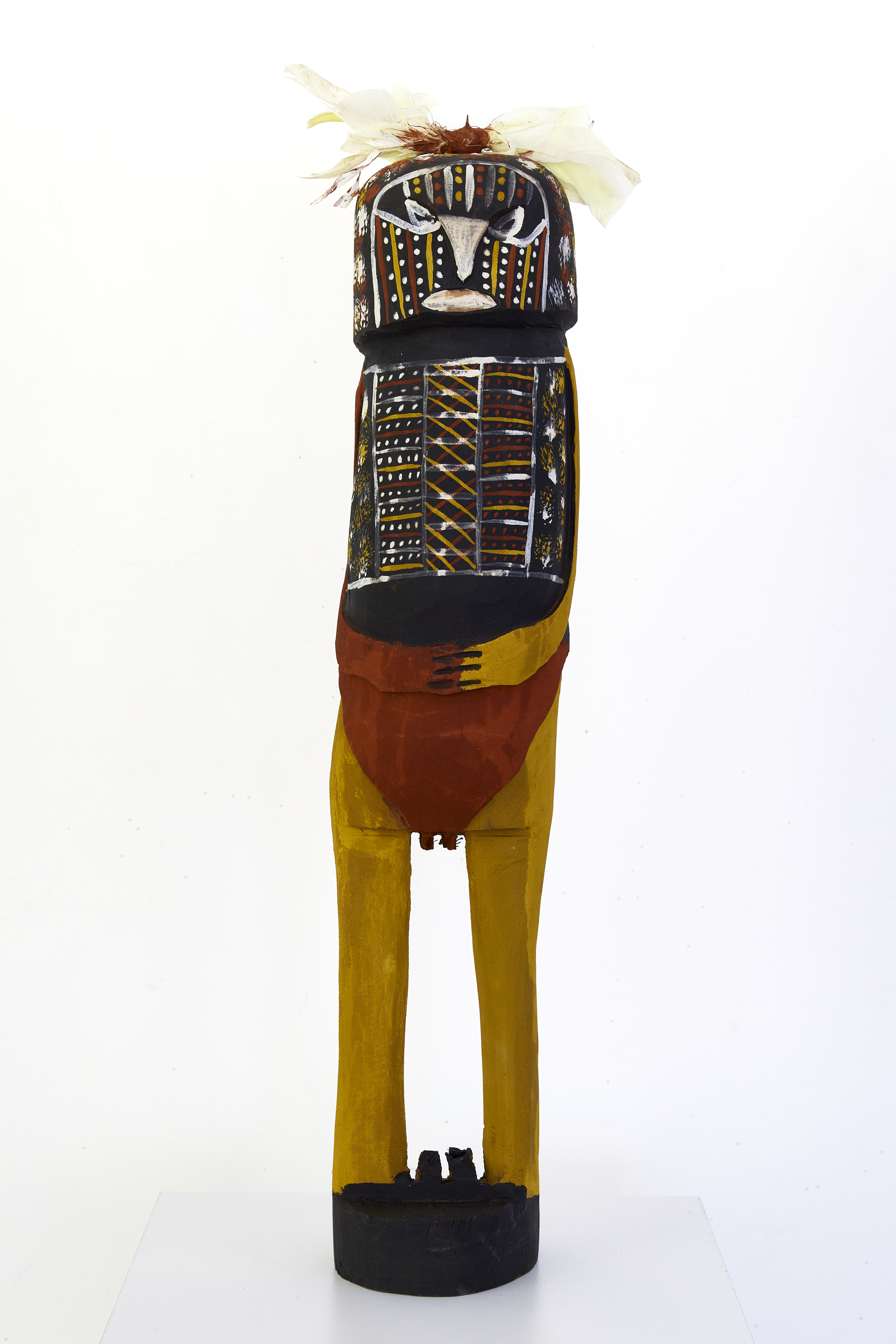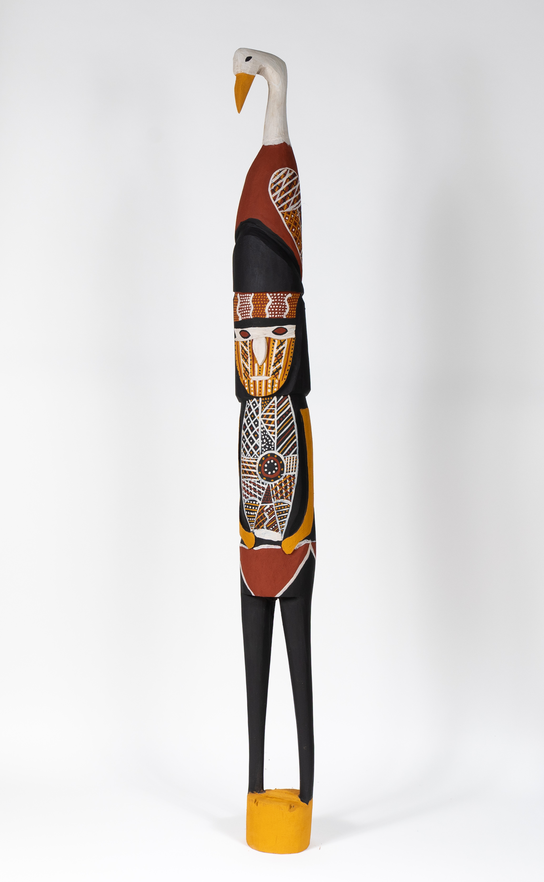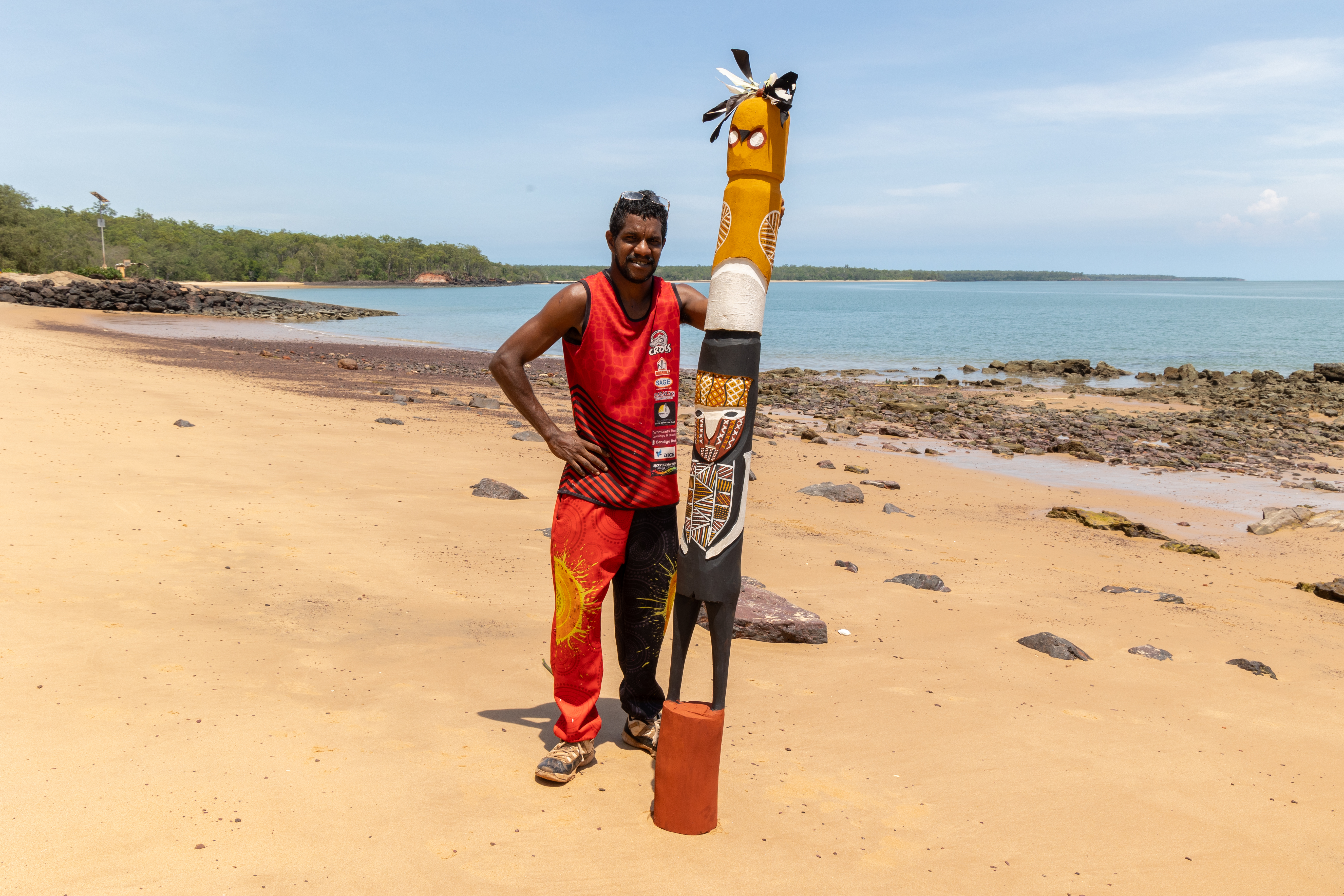 Walter Brooks is a young carver and artist at Jilamara Arts and Crafts Association. He is mentored by senior carver Patrick Freddy Puruntatameri and spends most of his days working in the open air Murrunungumirri carving workshop. He uses locally sourced ironwood and earth pigments to make tokwampini (birds), figurative works which represent the Tiwi creation story, tutuni poles and ceremonial spears.