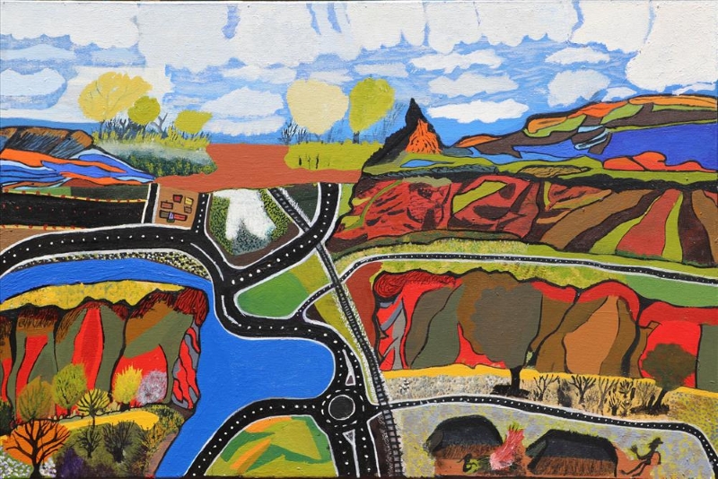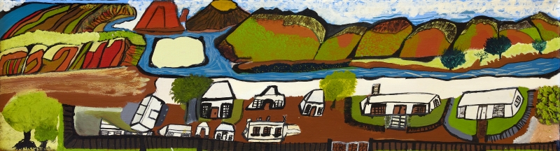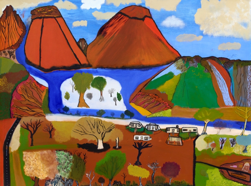 Charles meditates on his home country as he paints and imbues his work with strong knowledge of and connection to significant cultural sites such as Ntaria (Hermannsburg), Mt Sonder, Glen Helen Gorge, Simpsons Gap, and greater Mparntwe (Alice Springs). His intricate line work captures the multitude of directions of the rock layers in this ancient land and conjures strong impressions of the shaping of country.